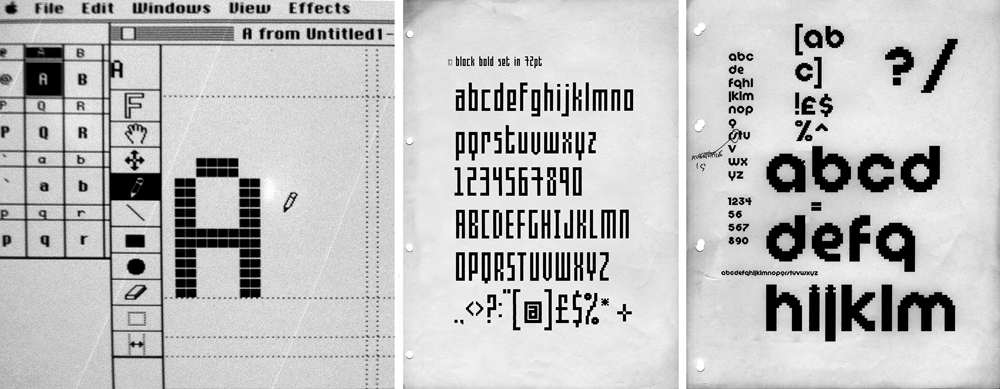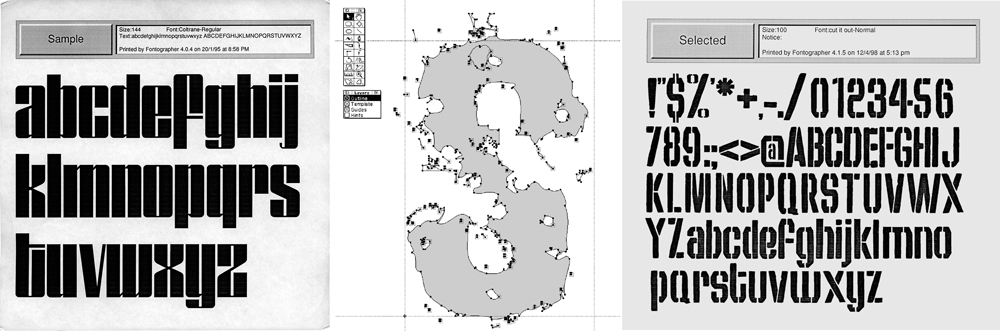 Left: Coltrane Sample from Fontographer 1995 Middle: Screen grab from Gunshot 1996 Right: Cut It Out Fontographer sampler 1997