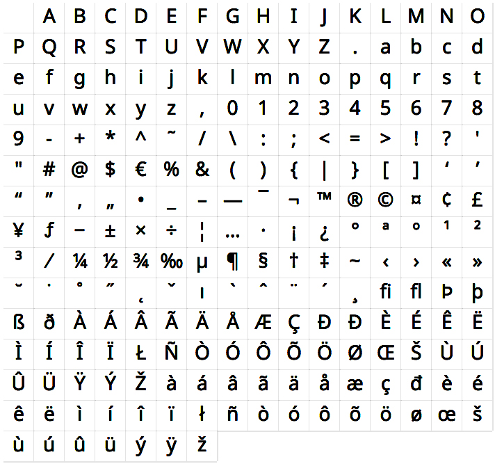 Each TypoMaticFont comes with following Glyphs